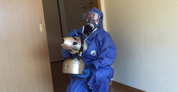 この時にフォグマスターやULVにて安定型次亜塩素酸ナトリウムなどで空間噴霧作業を行い、除菌消臭を行います。