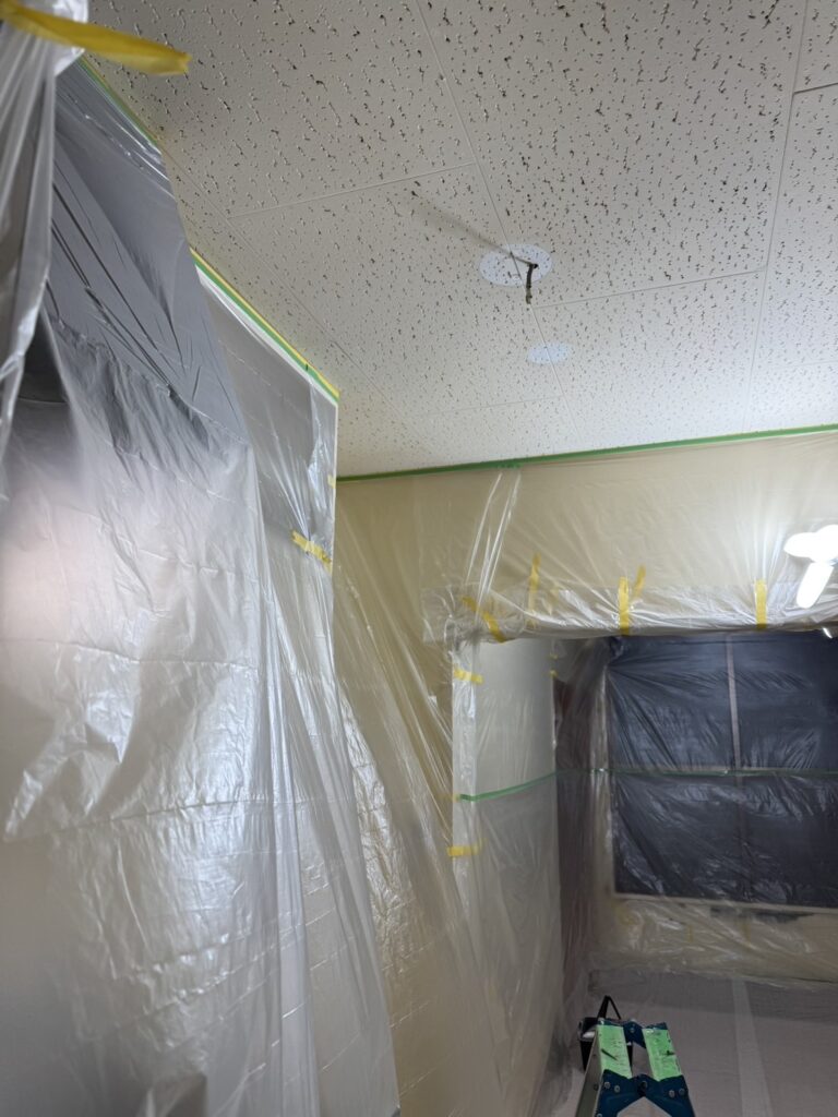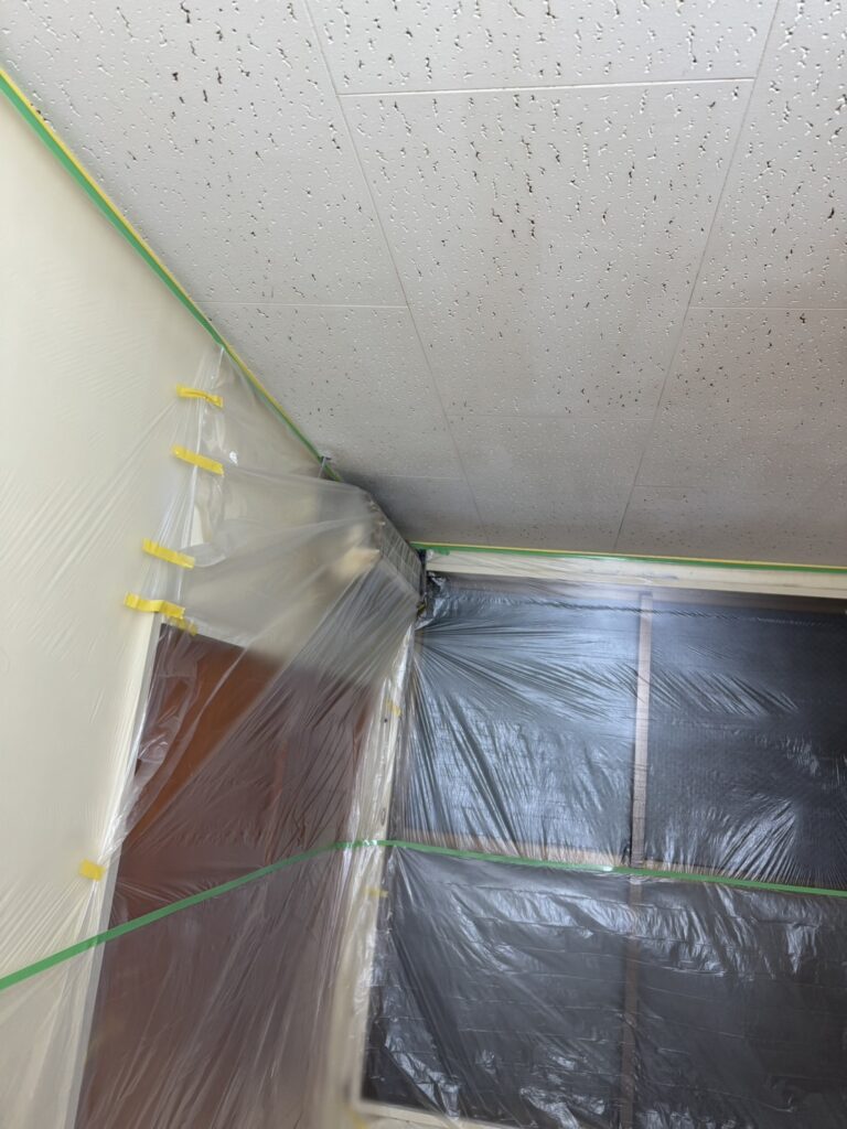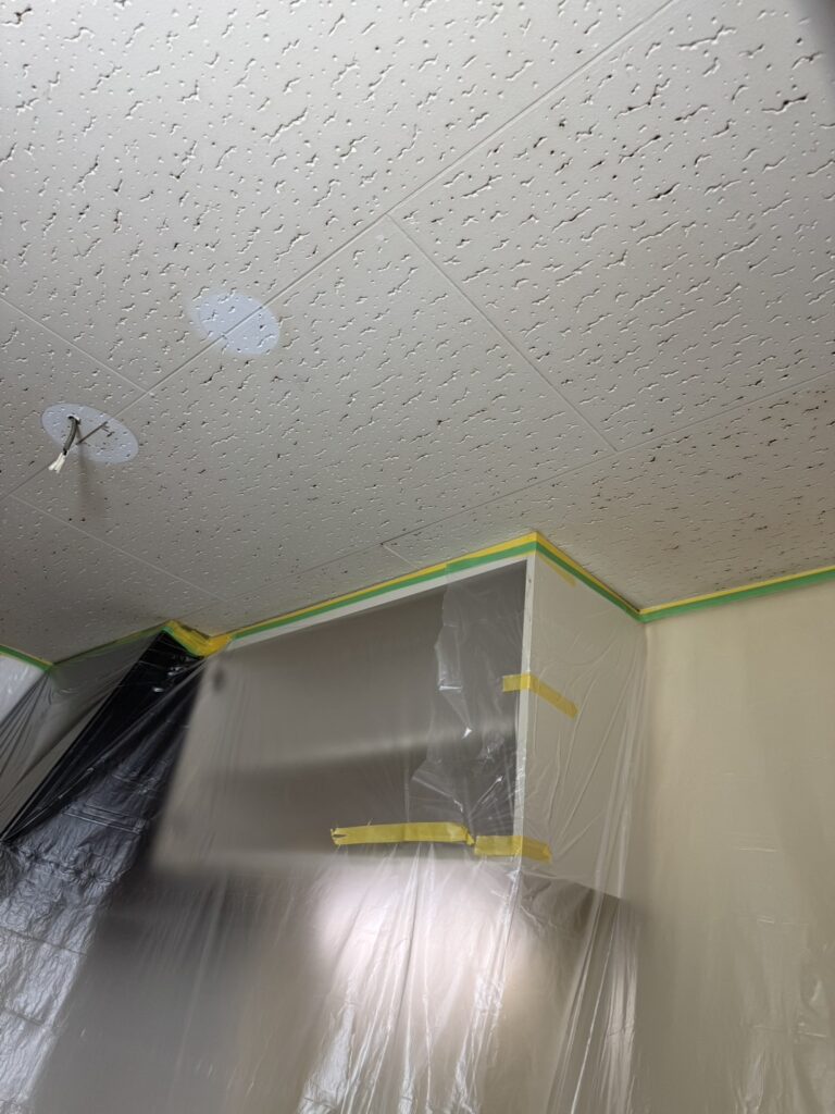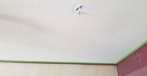 天井をコーディング(塗装)しますので、床の養生から始まり壁まで全面養生いたします。天井をローラーで塗る場合、塗料が霧状になって飛び散ります。塗らない箇所や汚したくない箇所を養生テープなどで覆います。 廻り縁など細かな箇所もしっかりマスキングいたします。