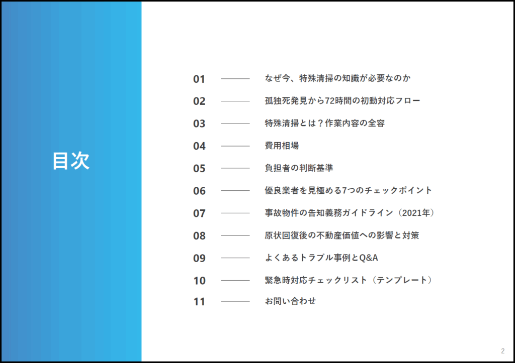 不動産管理の現場で年々増加する「孤独死」への対応。この度、現場の実務担当者の声を集約し、実践的な対応マニュアルとして「不動産管理会社のための特殊清掃完全ガイド」を作成いたしました。本ガイドは、無料でダウンロードできます。ぜひ不動産管理業務でお役立てください。